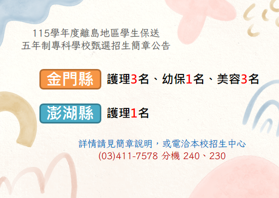 <![CDATA[~歡迎來到招生中心~ - 五專最新消息]]> utf-8 2025-11-10 17:00:01 2025-11-10 17:00:01 <![CDATA[115學年度離島地區保送五年制專科學校甄選招生簡章]]>